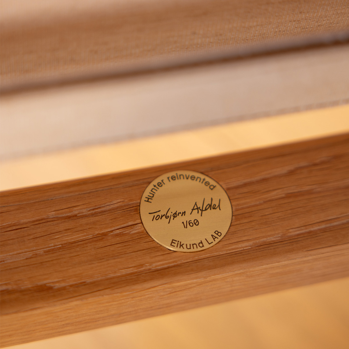 Eikund 現已推出 60 件 Hunter 帆布休閒椅首發版,採用對比色縫線,並配有獨一無二的編號黃銅紀念幣。吊牌也專為這 60 件產品定制,採用 Hunter 椅原生產過程中回收的皮革邊角料製成,並附有簽名證書。